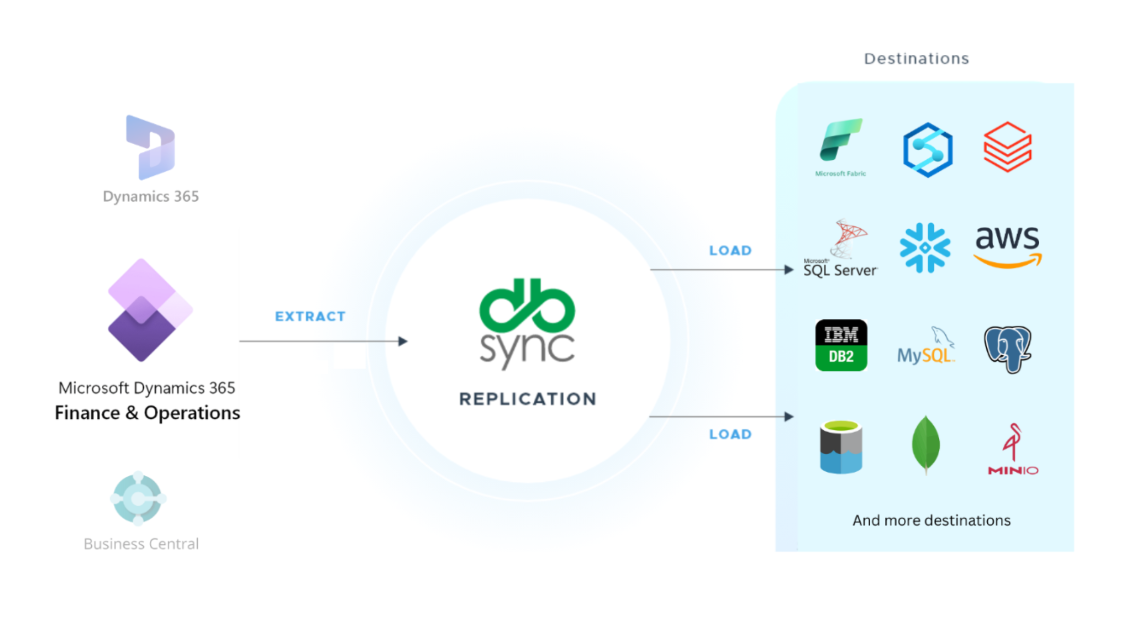 Automated data flows from Dynamics F&O to any cloud or on-prem destination in 5 simple steps with DBSync’s no-code replication platform.