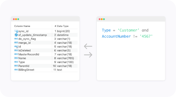 The application replicates the Salesforce CRM or MS Dynamics 365 CRM schema automatically for all objects.. The schema differences are evaluated and the corresponding columns are generated in the Database. No existing columns for a given table will be removed so that historical data is maintained.